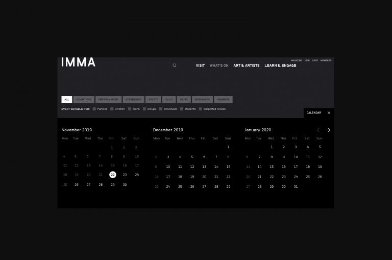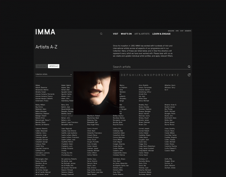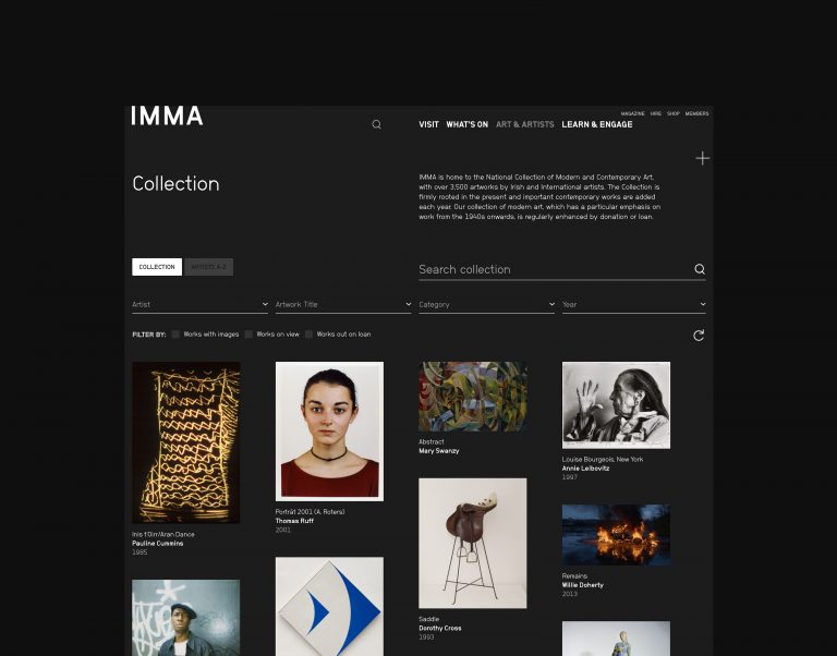 The project followed a user-centric methodology and went through several rounds of testing and design iteration at every stage in the process, from concept and architecture to navigation and design.The website serves many purposes including, an information directory, an events calendar, an online gallery, an archive, a learning resource, an editorial journal and a shop. We worked with internal teams and external suppliers to unite this in one space, making much of IMMA’s growing collection available to view for many for the very first time. We developed a versatile CMS and image library making management, updates and promotion a straightforward process.